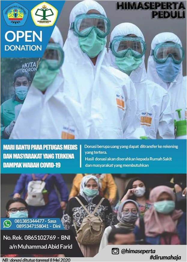 Saat ini kita sedang dihadapi dengan wabah Covid-19 yang penyebarannya semakin meluas. Sebagai mahasiswa, mari kita bantu petugas medis dan masyarakat yang terkena dampak wabah Covid-19. Himaseperta FP Unila membuka donasi untuk disumbangkan kepada petugas medis dan masyarakat yang terkena dampak Covid-19. Hasil donasi akan diserahkan kepada Rumah Sakit dan masyarakat yang membutuhkan. Silahkan hubungi kontak yang tertera: