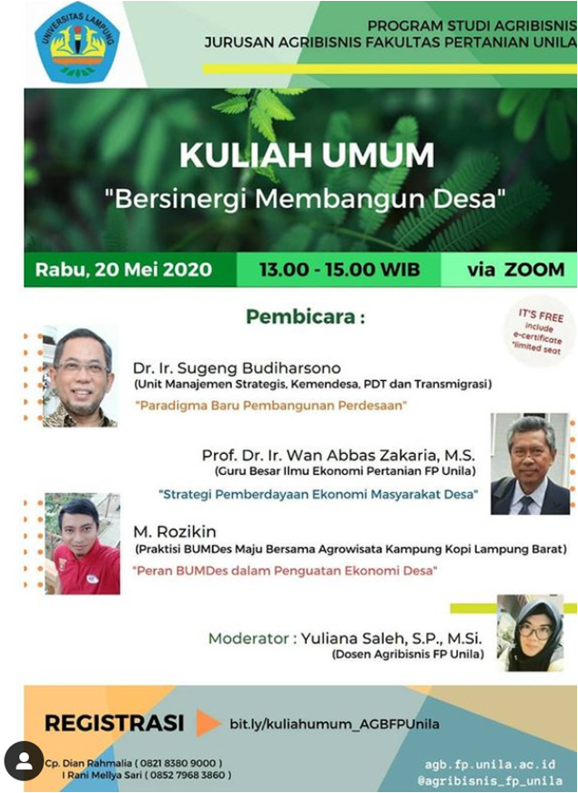 Program Studi Agribisnis Fakultas Pertanian Universitas Lampung akan menyelenggarakan Kuliah Umum dengan tema “Bersinergi Membangun Desa” yang akan dilaksanakan pada Hari Rabu, tanggal 20 Mei 2020 pukul 13.00-15.00 WIB via zoom.
