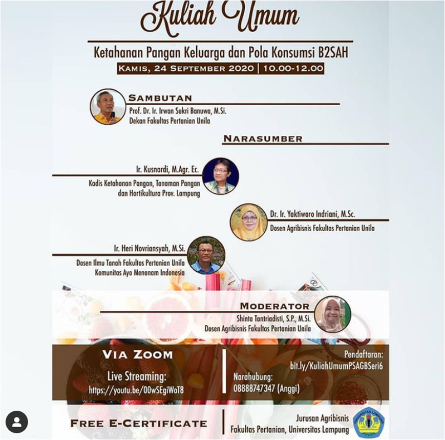 PS Agribisnis Jurusan Agribisnis Universitas Lampung akan menyelenggarakan Kuliah Umum dengan tema “Ketahanan Pangan Keluarga dan Pola Konsumsi B2SAH” Yang akan dilaksanakan pada Hari Kamis, tanggal 24 September 2020 pukul 10.00-12.00 WIB via zoom.