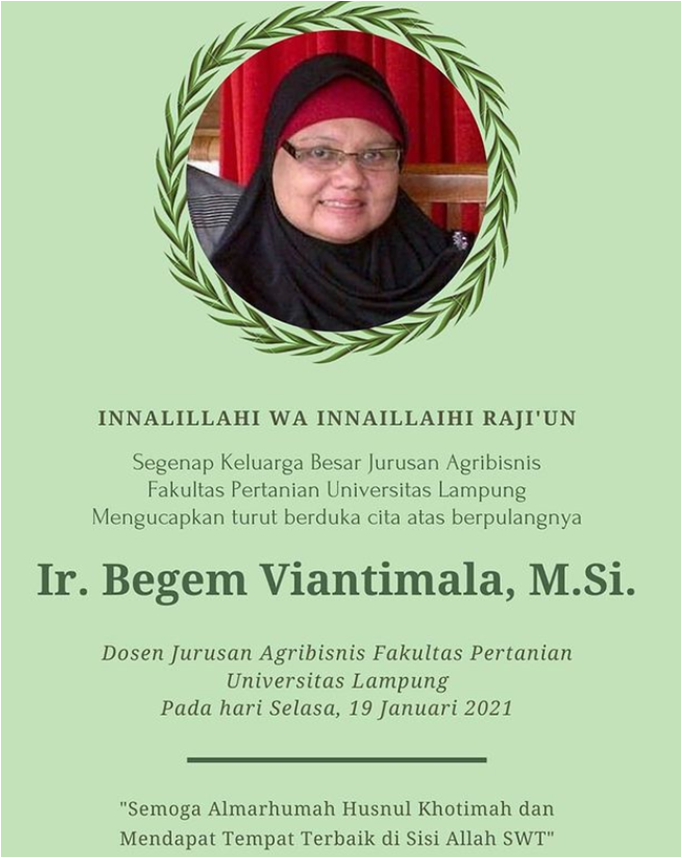 “Innalillahi wa innaillaihi raji’un. Telah berpulang ke rahmatullah Ir. Begem Viantimala, M.Si. pada Hari Selasa, 19 Januari 2021 pukul 05.01 WIB di Rumah Sakit Urip Sumoharjo Bandar Lampung. Mohon do’a dan maaf apabila ada salah dan khilaf selama ini.”