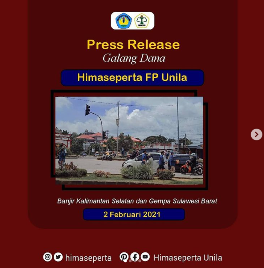 Alhamdulillah telah terlaksana Aksi Galang Dana Himaseperta Fakultas Pertanian Universitas Lampung dalam rangka peduli korban bencana alam Kalimantan Selatan dan Sulawesi Barat. Selasa (02/02) di Bundaran Raden Intan Hajimena dan Way Halim.