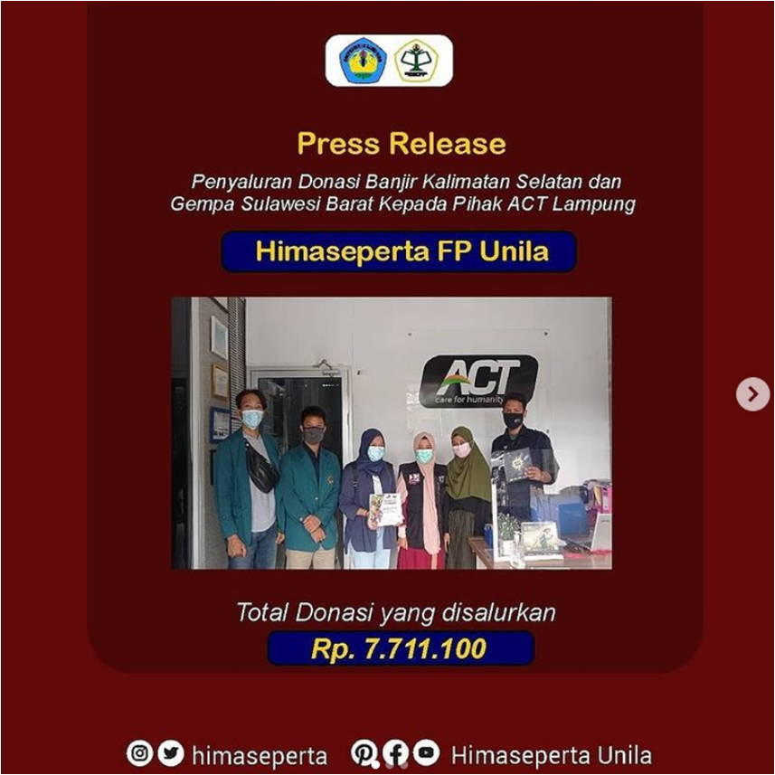 Alhamdulillah Himaseperta Fakultas Pertanian Universitas Lampung telah melakukan Penyaluran donasi kepada pihak ACT dalam rangka peduli korban bencana alam Kalimantan Selatan dan Sulawesi Barat. Selasa (09/02/2021) di Kantor ACT Cabang Lampung.