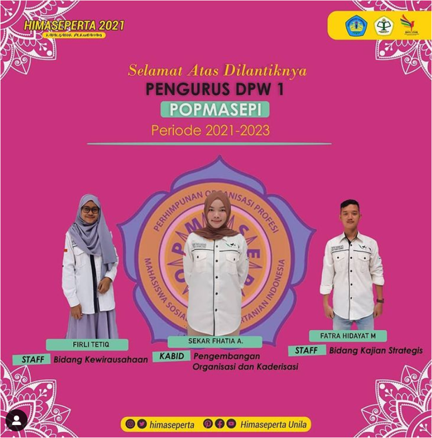 Selamat atas dilantiknya mahasiswa Jurusan Agribisnis FP Unila menjadi Pengurus DPW 1 POPMASEPI Periode 2021-2023, yaitu: