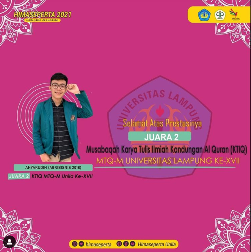 Ahyarudin (Mahasiswa Jurusan Agribisnis 2018) sebagai Juara 2 Musabaqah Karya Tulis Ilmiah Kandungan Al Quran dalam MTQ-M Universitas Lampung Ke-XVII pada tanggal 16 Maret-9 April 2021.