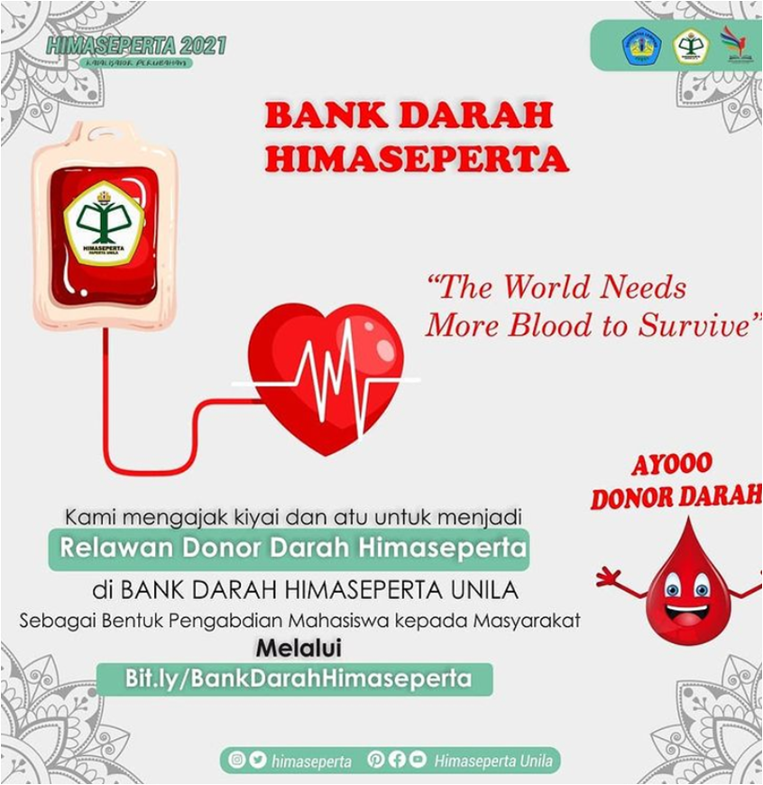 Untuk itu kami mengajak Kiyay dan Atu untuk mau mendaftarkan diri sebagai relawan Bank Darah Himaseperta Universitas Lampung.