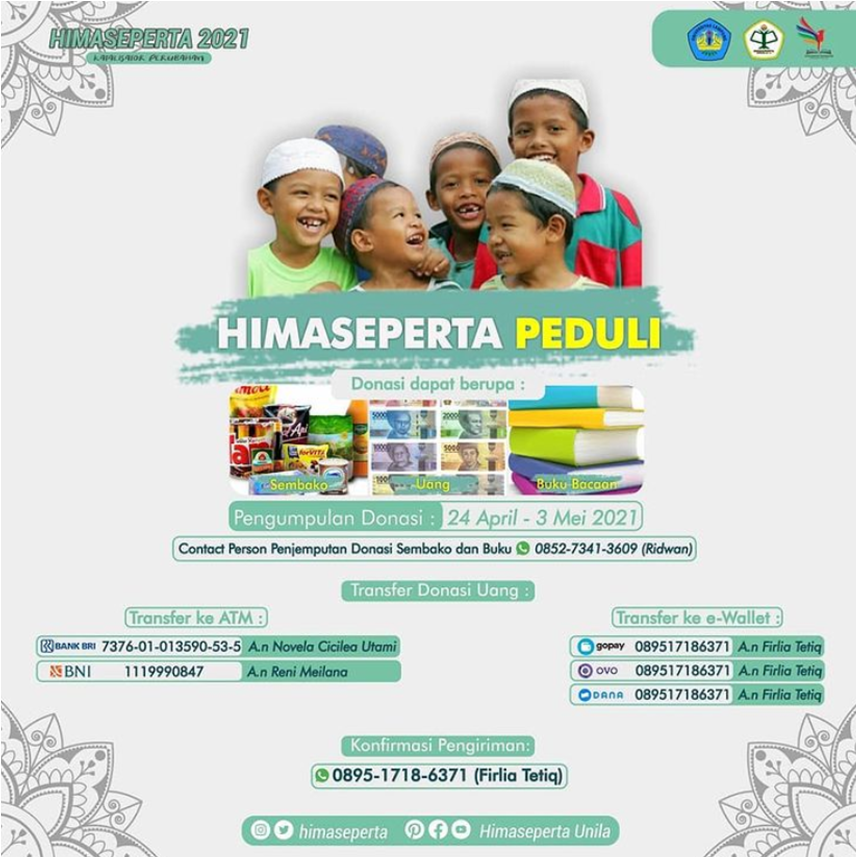 Dalam rangka bulan suci Ramadhan, Kami Keluarga Besar HIMASEPERTA FP Unila mengadakan Open Donasi untuk santunan anak yatim piatu. Kecil dan besar yang kita keluarkan sangat berharga bagi saudara-saudara kita semua.