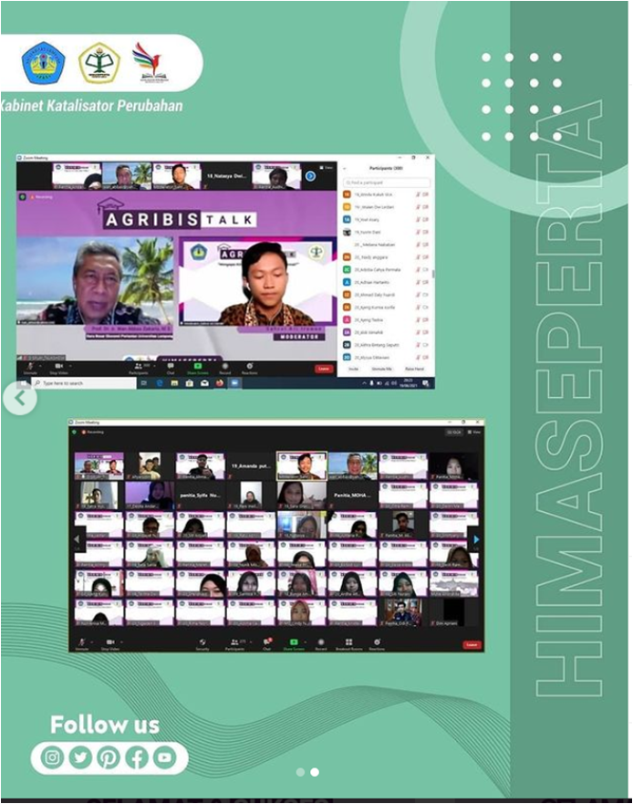 Himaseperta FP Unila laksanakan AGRIBIS TALK dengan mengangkat topik “mengapa kita harus jadi petani milenial?” yang diisi oleh Bapak Prof. Dr. Ir. Wan Abbas Zakaria, M.S. selaku Guru Besar Ekonomi Pertanian Universitas Lampung yang diikut oleh 327 mahasiswa. Segenap panitia mengucapkan terima kasih atas partisipasi dan kontribusi terhadap pihak-pihak terkait, dalam mensukseskan kegiatan ini (19/06/2021).