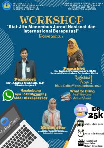 Laboratorium Penyuluhan dan Pemberdayaan Masyarakat Jurusan Agribisnis FP Universitas Lampung laksanakan Workshop dengan tema “Kiat Jitu Menulis Jurnal Nasional dan Internasional Bereputasi” secara online (03/07/2021). Workshop ini dibuka secara resmi oleh Ketua Jurusan Agribisnis FP Unila Bapak Dr. teguh Endaryanto, S.P., M.Si. Workshop ini dinarasumberi oleh Ketua PS Penyuluhan Pertanian Ibu Ir. Indah Nurmayasari, M.Sc dan Bapak dr. Abdul Mutholib, S.P. Workshop ini dimaksudkan untuk melatih, mempersiapkan, serta memberikan kiat jitu agar terjadi peningkatan keterampilan menulis khususnya jurnal ilmiah hingga dapat menembus skala nasional bahkan internasional.