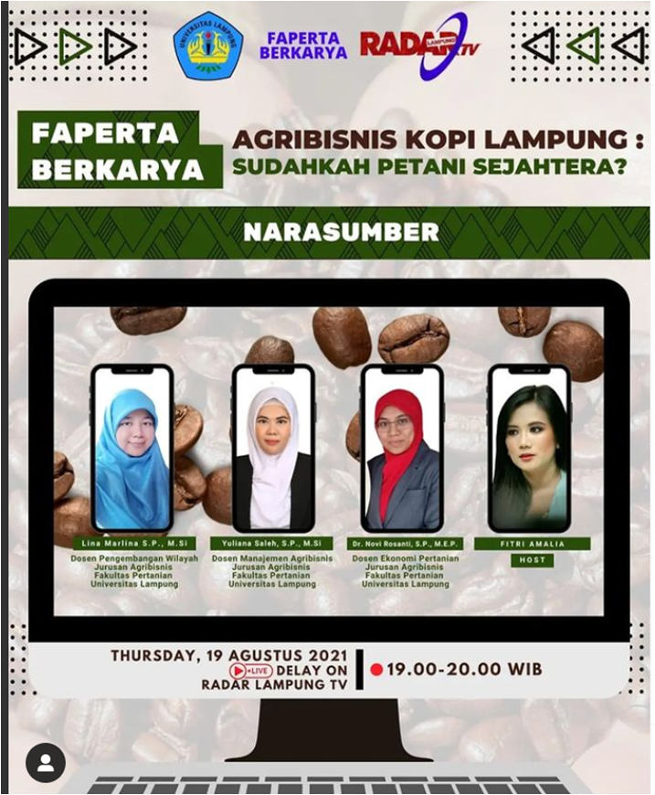 Dosen Jurusan Agribisnis Fakultas Pertanian Universitas Lampung (Agribisnis FP Unila) Ibu Dr. Novi Rosanti, S P., M E P., Ibu Lina Marlina, S.P., M.Si., dan Ibu Yuliana Saleh, S.P., M.Si., mengisi siaran menjadi narasumber Faperta Berkarya dengan topik “ Mampukah Agribisnis Kopi Membuat Petani Sejahtera?”, bertempat di Laboratorium Lapang Terpadu FP Unila, Kamis (19/8/2021).