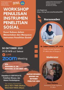 Laboratorium Penyuluhan dan Pemberdayaan Masyarakat Jurusan Agribisnis Fakultas Pertanian Universitas Lampung menggelar giat Workshop Penulisan Instrumen Penelitian Sosial secara online bagi mahasiswa dan umum (30/10/2021). Workshop ini dibuka secara resmi oleh Ketua Program Studi Penyuluhan Pertanian Ibu Ir. Indah Nurmayasari, M.Sc. Workshop ini diisi oleh Ibu Dr. Indah Listiana, S.P., M.Si dengan topik kunci suskes dalam menentukan dan menyusun instrumen penelitian sosial.