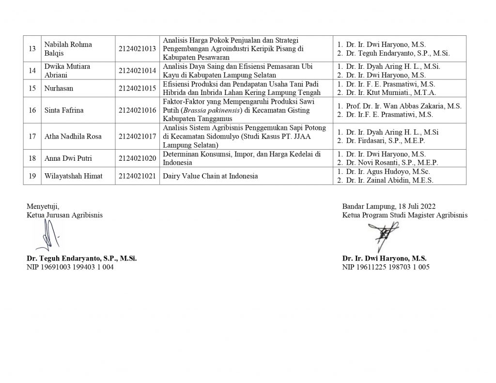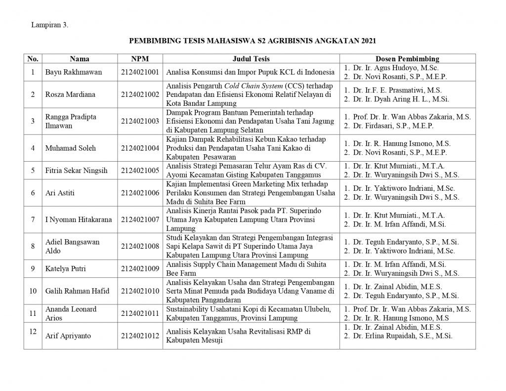 Dalam rangka penyelesaian studi, Ketua Program Studi Magister Agribisnis Bapak Dr. Ir. Dwi Haryono, M.S telah melakukan rapat bersama para dosen pengajar dan mencapai kesepakatan terkait dosen pembimbing tesis mahasiswa. Susunan dosen pembimbing angkatan 2021 dapat dilihat pada lampiran.