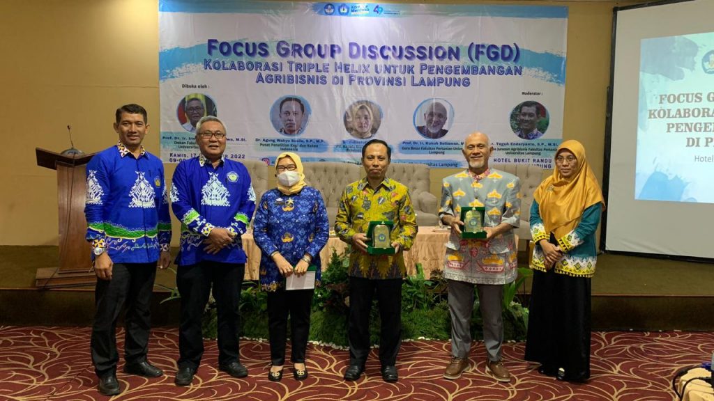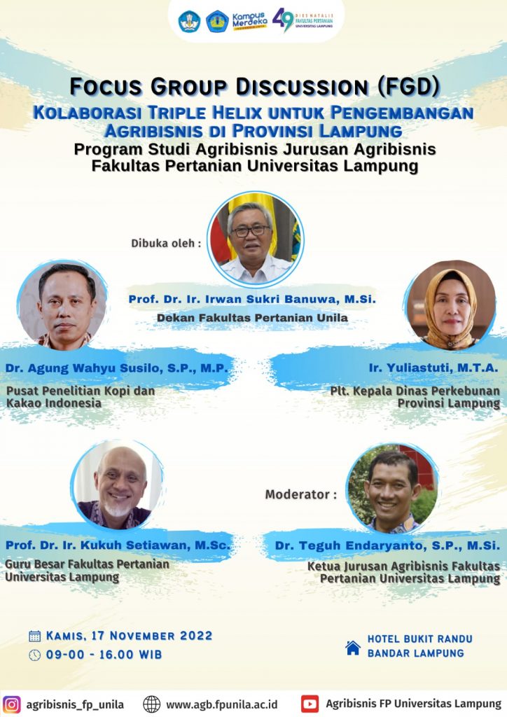 Dalam laporannya, Ketua Program Studi Agribisnis FP Unila Ibu Dr. Novi Rosanti, S.P., M.E.P. menyampaikan bahwa dalam usaha mewujudkan dan mengimplementasikan strategi pembangunan agribisnis diperlukan sinergi triple helix. Triple helix adalah hubungan antara akademisi, swasta (bisnis) dan pemerintah. Kolaborasi dari triple helix diharapkan dapat menjadi penggerak utama lahirnya kreativitas, ide, ilmu pengetahuan, dan teknologi yang vital dalam merumuskan kebijakan yang terkait industri, penelitian dan pengembangan ilmu pengetahuan serta teknologi. FGD riset kolaboratif ini bertujuan untuk :