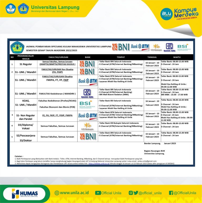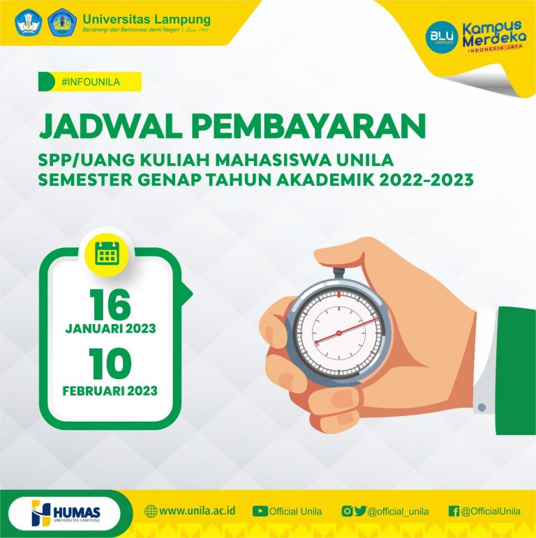 Hallo #Sobatunila berikut kami sampaikan jadwal Pembayaran SPP/ Uang Kuliah Mahasiswa Universitas Lampung Semester Genap Tahun Akademik 2022-2023.