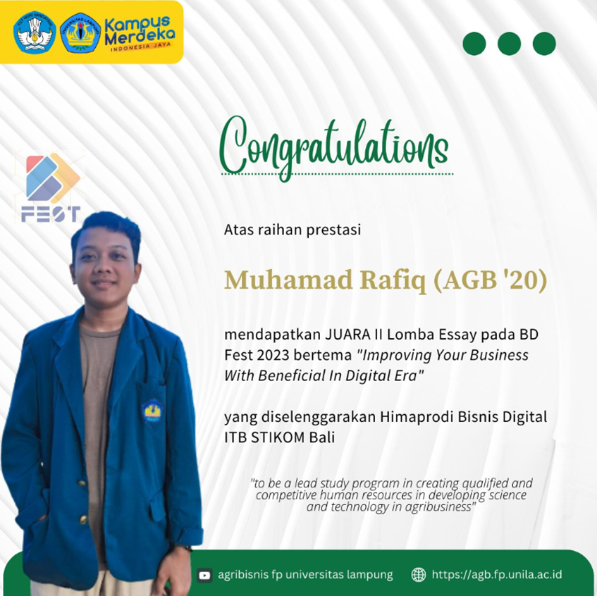Muhamad Rafiq, mahasiswa Program Studi Agribisnis Fakultas Pertanian Universitas Lampung angkatan 2020 berhasil meraih Juara II pada Lomba Essay mengembangkan agrobisnis dengan ide kreatif dan inovatif di era digital tingkat nasional BD Fest 2023. Perlombaan ini diselenggarakan oleh Himaprodi Bisnis Digital ITB Stikom Bali pada Bulan Mei 2023.