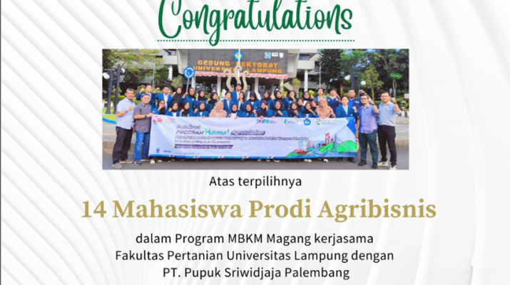Sebanyak 2 orang mahasiswa angkatan 2019 dan 12 orang mahasiswa angkatan 2020 Program Studi Agribisnis Fakultas Pertanian Universitas Lampung terpilih menjadi peserta MBKM Magang