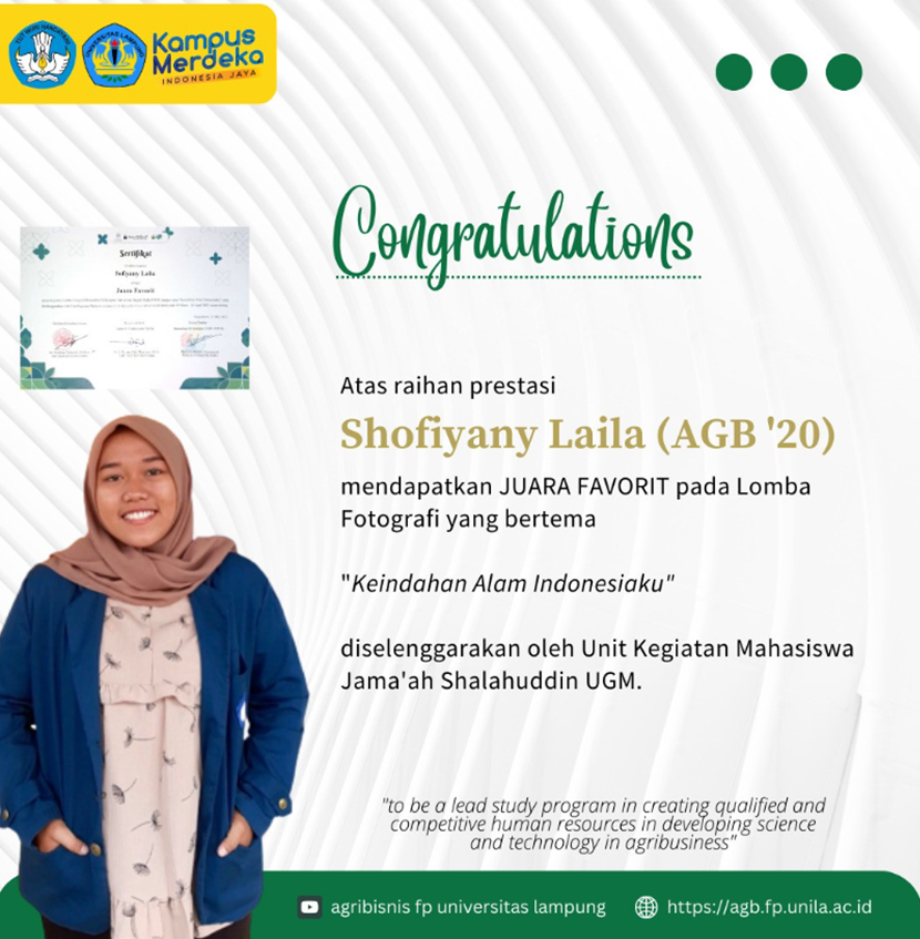 Shofiyany Laila, mahasiswa Program Studi Agribisnis Fakultas Pertanian Universitas Lampung angkatan 2020 ini berhasil mendapatkan Juara Favorit pada lomba Fotografi yang bertema Keindahan Alam Indonesiaku.