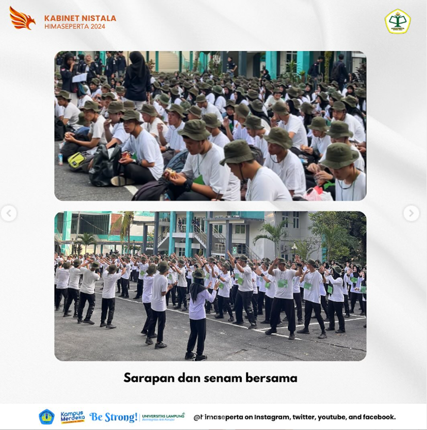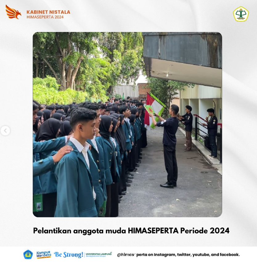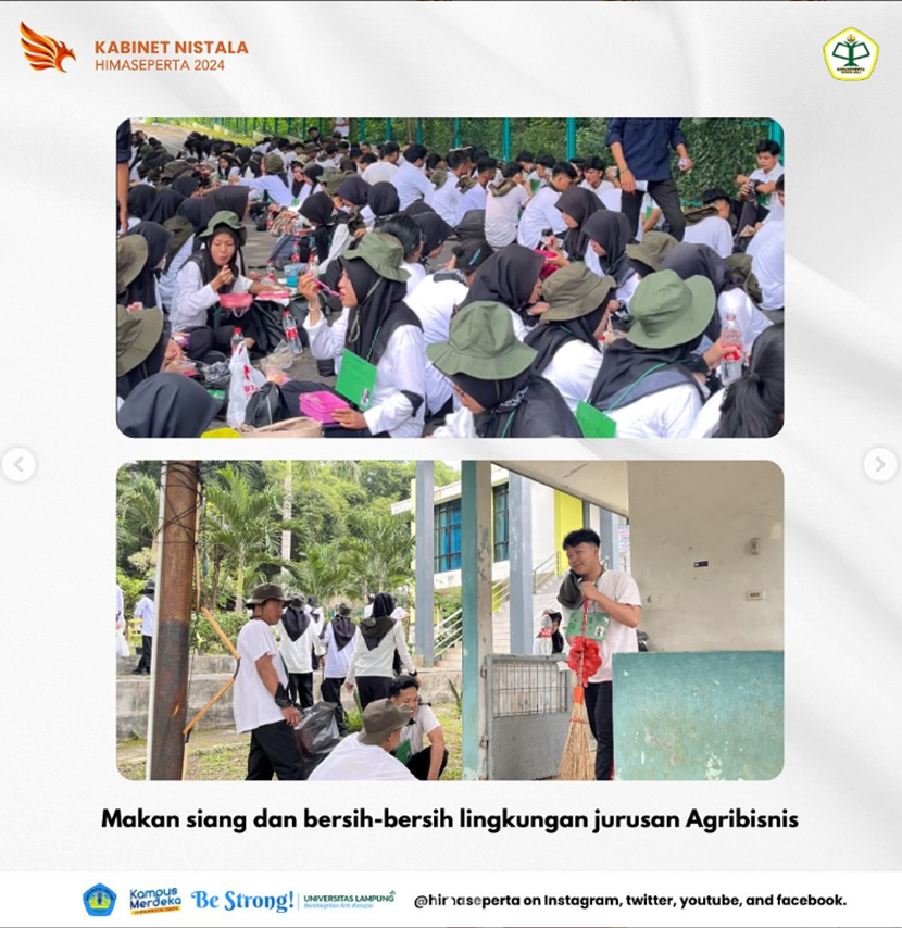 Serangkaian kegiatan Sunday One oleh HIMASEPERTA UNILA dengan tema “Membentuk Karakter Calon Anggota Muda yang Memiliki Sikap Empati, Solidaritas dan Bertanggung Jawab Terhadap HIMASEPERTA” telah selesai dilaksanakan pada hari Minggu, 19 Mei 2024 di pelataran N Gedung Jurusan Agribisnis, Fakultas Pertanian, Universitas Lampung.