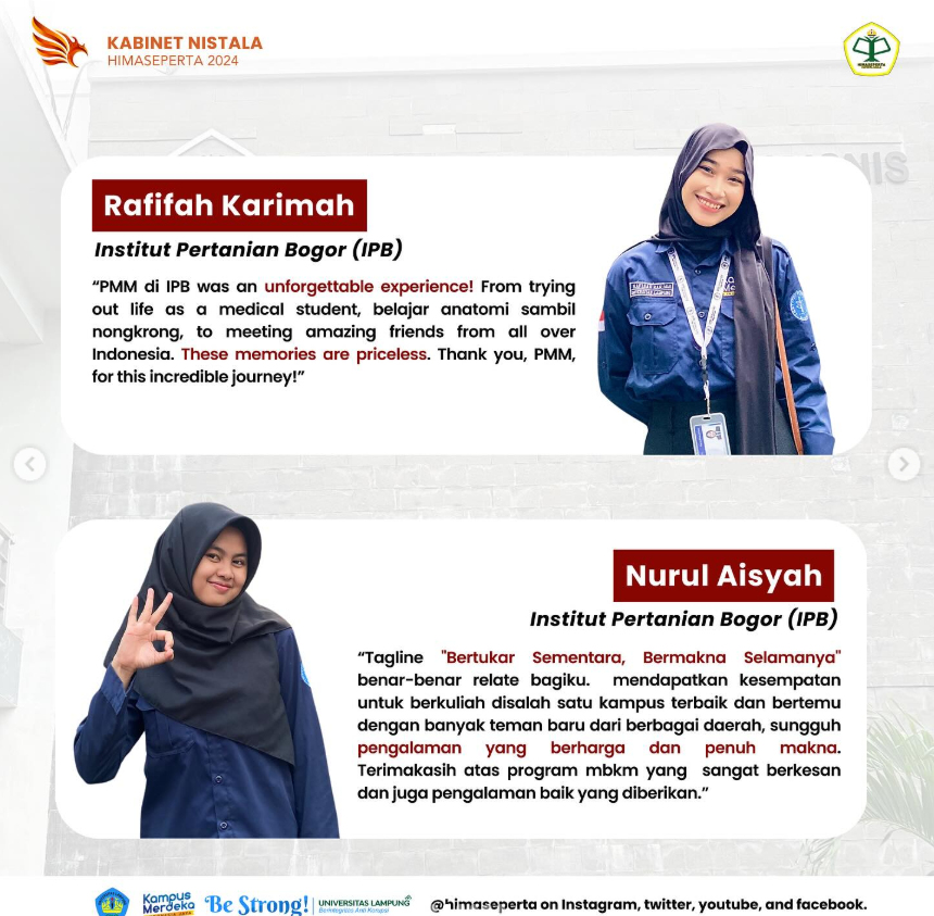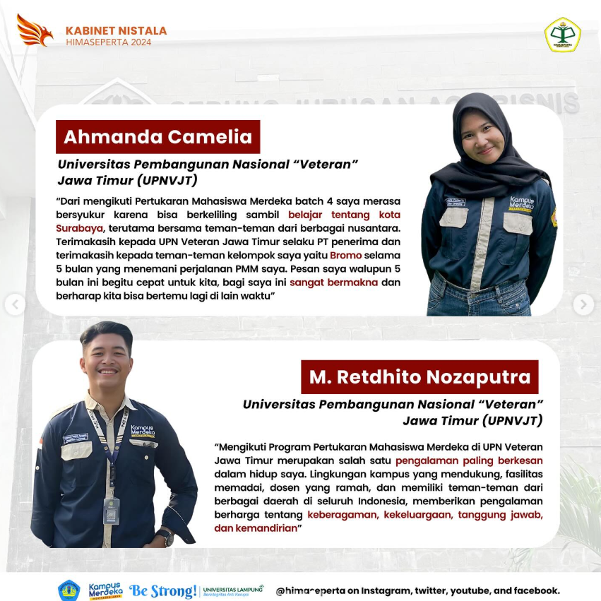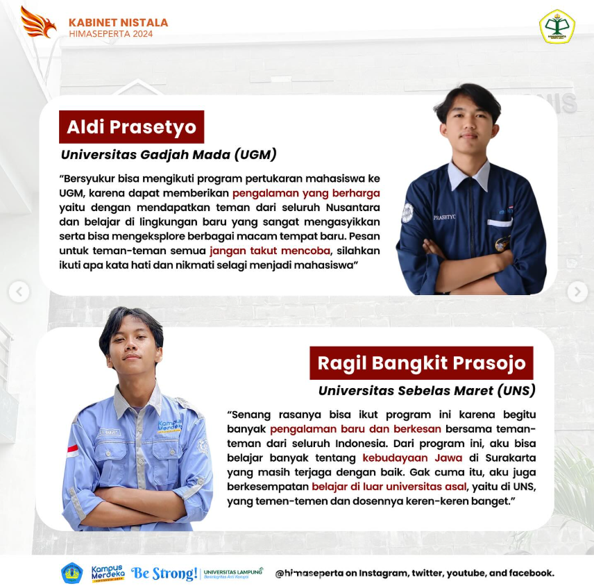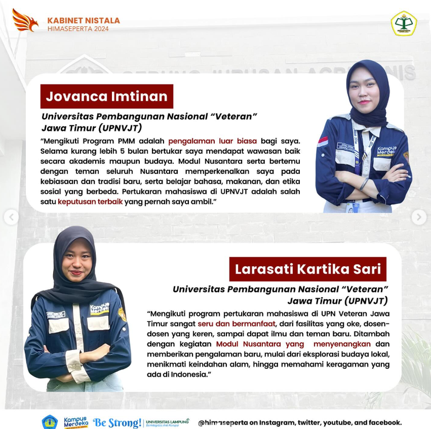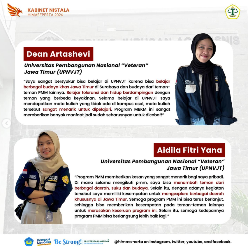 “Selamat dan sukses kepada mahasiswa Agribisnis 2022 atas keberhasilannya dalam program Pertukaran Mahasiswa Merdeka (PMM) tahun 2024. Semoga pengalaman ini membawa banyak ilmu dan inspirasi baru. Teruslah berprestasi dan menjadi kebanggaan kita semua,” tulis akun resmi HIMASEPERTA di media sosial.