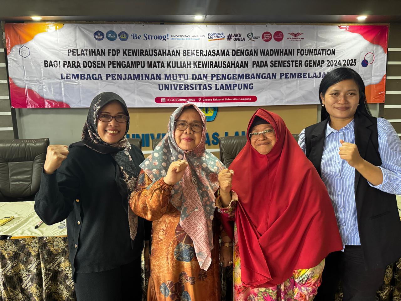 Bandar Lampung, 5 Januari 2025 — Empat dosen dari Jurusan Agribisnis Fakultas Pertanian Universitas Lampung turut ambil bagian dalam Pelatihan FDP Kewirausahaan yang diselenggarakan oleh Lembaga Penjaminan Mutu dan Pengembangan Pembelajaran (LPMPP) Universitas Lampung, bekerja sama dengan Wadhwani Foundation. Kegiatan ini berlangsung pada 3–4 Januari 2025 bertempat di Ruang Sidang Rektorat Universitas Lampung.