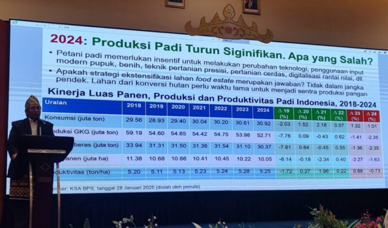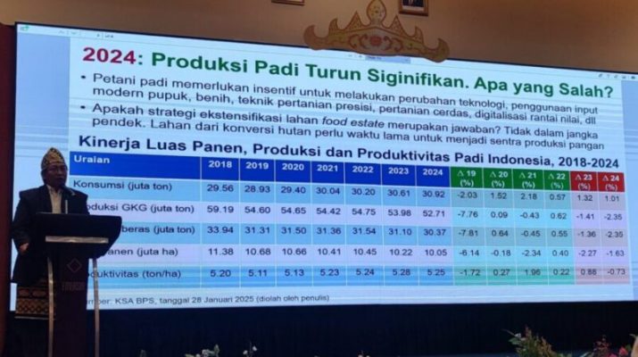 Ia juga mencatat bahwa pada 2024, produksi gabah kering giling (GKG) turun menjadi 52,71 juta ton, atau turun 2,35% dari tahun sebelumnya. Hal ini berdampak langsung pada penurunan produksi beras sebesar 730 ribu ton, yang berbanding terbalik dengan tren konsumsi yang terus meningkat.