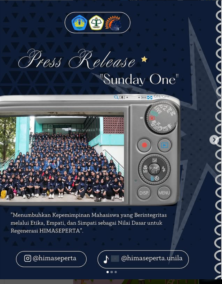Sunday One merupakan program pembinaan dan penguatan karakter mahasiswa baru HIMASEPERTA yang bertujuan menanamkan nilai-nilai kepemimpinan, etika, dan empati dalam kehidupan berorganisasi. Melalui berbagai sesi interaktif, diskusi, dan kegiatan kolaboratif, peserta diajak memahami makna kepemimpinan yang berintegritas serta pentingnya menjunjung moralitas dalam setiap tindakan.
