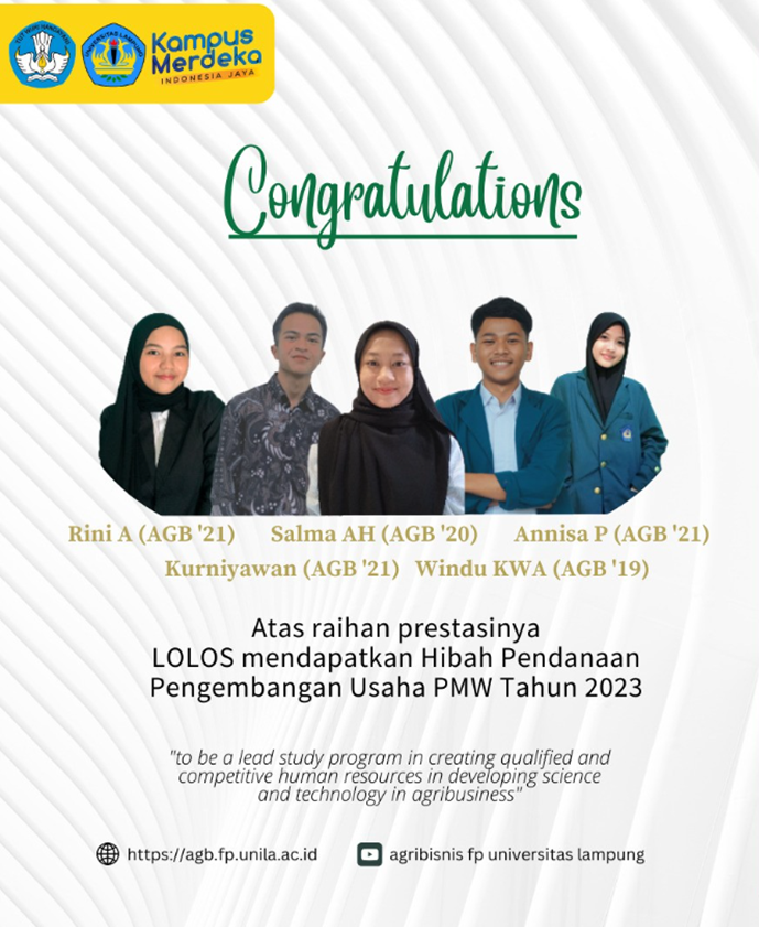 Selamat kepada mahasiswa-mahasiswa agribisnis lainnya yang juga menjadi bagian dari kelompok yang LOLOS mendapatkan Hibah Pendanaan Pengembangan Usaha PMW Tahun 2023.