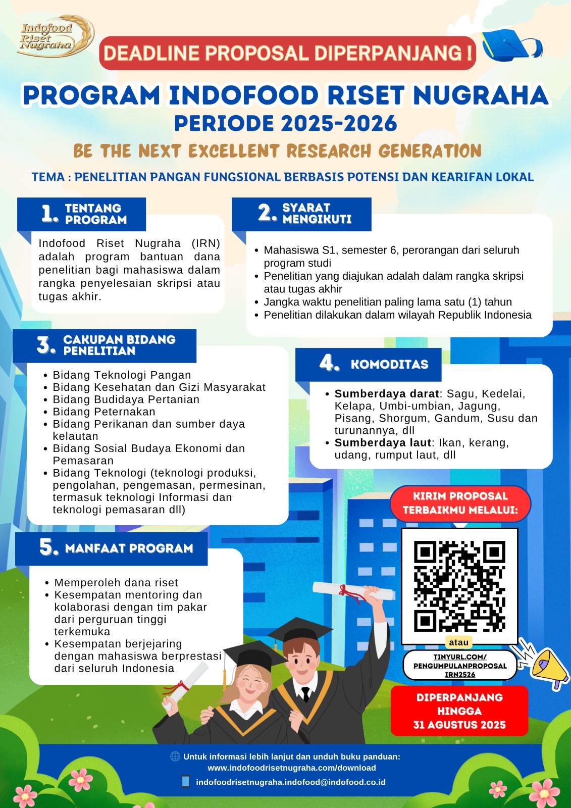 Program Indofood Riset Nugraha (IRN) Periode 2025–2026Tema: Penelitian Pangan Fungsional Berbasis Potensi dan Kearifan LokalDeadline Proposal Diperpanjang hingga 31 Agustus 2025 Indofood Riset Nugraha merupakan program bantuan dana penelitian bagi mahasiswa S1 dalam rangka penyelesaian skripsi atau tugas akhir. 🔹 Syarat Peserta: 🔹 Cakupan Bidang Penelitian: 🔹 Komoditas: 🔹 Manfaat Program: 📥 Pengiriman Proposal:Melalui QR […]