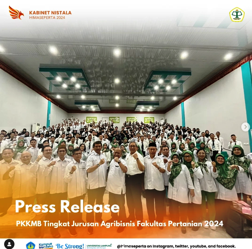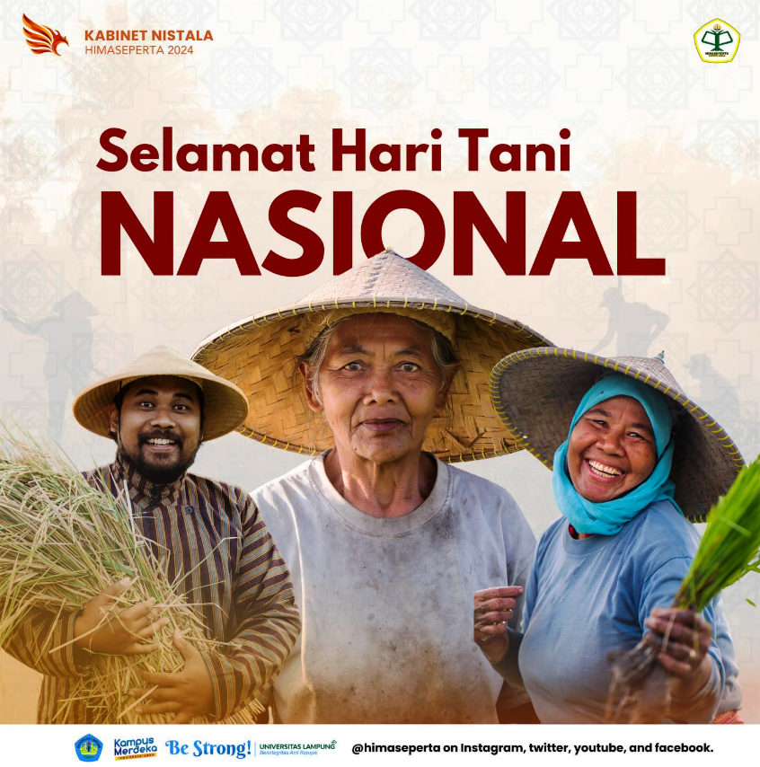Dalam semangat memperingati Hari Tani Nasional 2024, HIMASEPERTA (Himpunan Mahasiswa Sosial Ekonomi Pertanian) Jurusan Agribisnis Fakultas Pertanian Universitas Lampung menyampaikan apresiasi dan rasa hormat setinggi-tingginya kepada seluruh petani Indonesia, sebagai garda terdepan dalam menjaga ketahanan pangan dan kedaulatan agraria bangsa. Kabinet Nistala 2024 menyampaikan ucapan: “Mari rayakan hari kebesaran kita sebagai seorang petani, sebagai mahasiswanya […]
