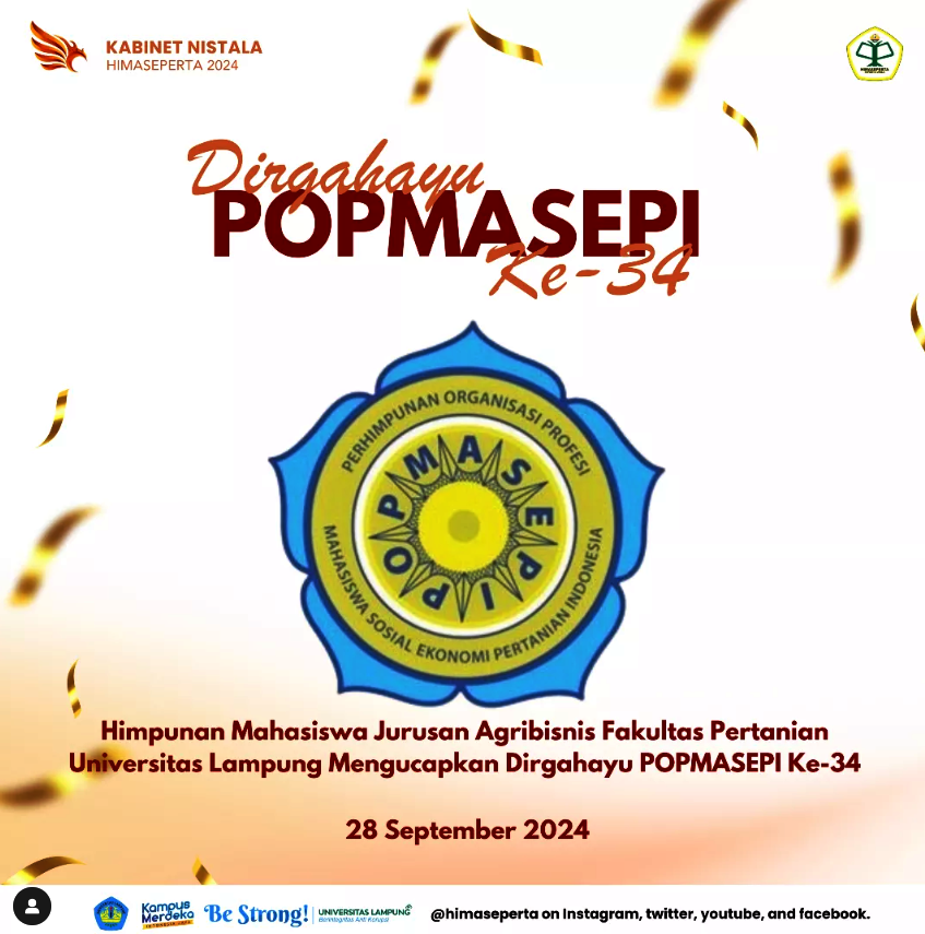 Keluarga Besar HIMASEPERTA (Himpunan Mahasiswa Sosial Ekonomi Pertanian) Jurusan Agribisnis Fakultas Pertanian Universitas Lampung turut menyampaikan ucapan selamat atas Dirgahayu POPMASEPI ke-34 tahun 2024. Melalui pernyataan resminya, Kabinet Nistala 2024 menyampaikan harapan agar POPMASEPI (Perhimpunan Organisasi Profesi Mahasiswa Sosial Ekonomi Pertanian Indonesia) terus menjadi garda terdepan dalam menggerakkan potensi mahasiswa pertanian di seluruh Indonesia. “Semoga […]