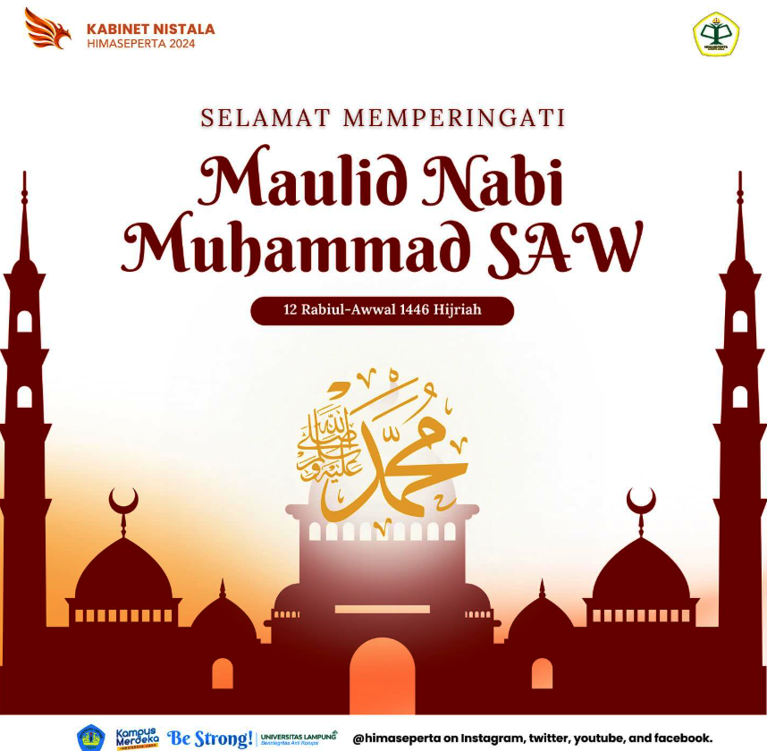 Dalam rangka memperingati Maulid Nabi Muhammad SAW 1446 H, HIMASEPERTA (Himpunan Mahasiswa Sosial Ekonomi Pertanian) Jurusan Agribisnis Fakultas Pertanian Universitas Lampung mengajak seluruh mahasiswa dan masyarakat untuk menjadikan momen ini sebagai refleksi spiritual dan penguatan nilai-nilai kebaikan. Melalui pernyataan resminya, Kabinet Nistala 2024 menyampaikan: “Selamat Memperingati Maulid Nabi Muhammad SAW. Jadikan momen ini sebagai kesempatan […]
