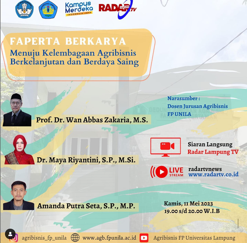 FAPERTA BERKARYAMenuju Kelembagaan Agribisnis Berkelanjutan dan Berdaya Saing Kamis, 11 Mei 2023live on Radar Lampung TV Narasumber :Prof. Dr. Ir. Wan Abbas Zakaria, M.SDr. Maya Riantini, S.P., M.SiAmanda Putra Seta, S.P., M.P Jangan lupa ajak keluarga untuk tonton dan saksikan bersama…
