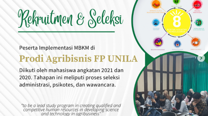 Rekrutmen dan Seleksi untuk implementasi MBKM PS Agribisnis FP Unila Tahun 2023 telah dilaksanakan pada minggu kedua Agustus 2023. Kegiatan ini diikuti oleh 91