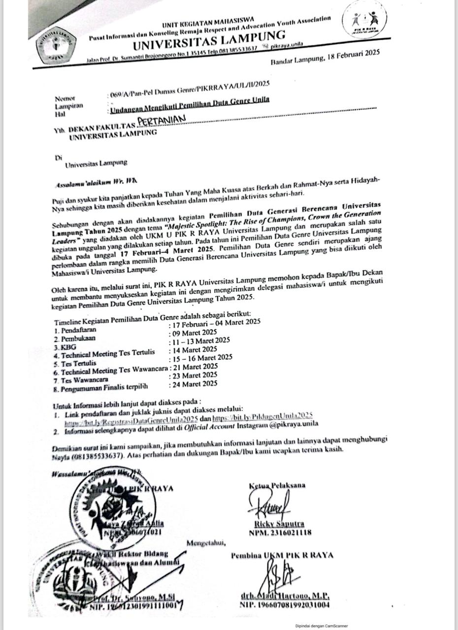 PENGUMUMAN PERPANJANGAN PENDAFTARAN DUTA MAHASISWA FAKULTAS PERTANIAN UNILA 2025