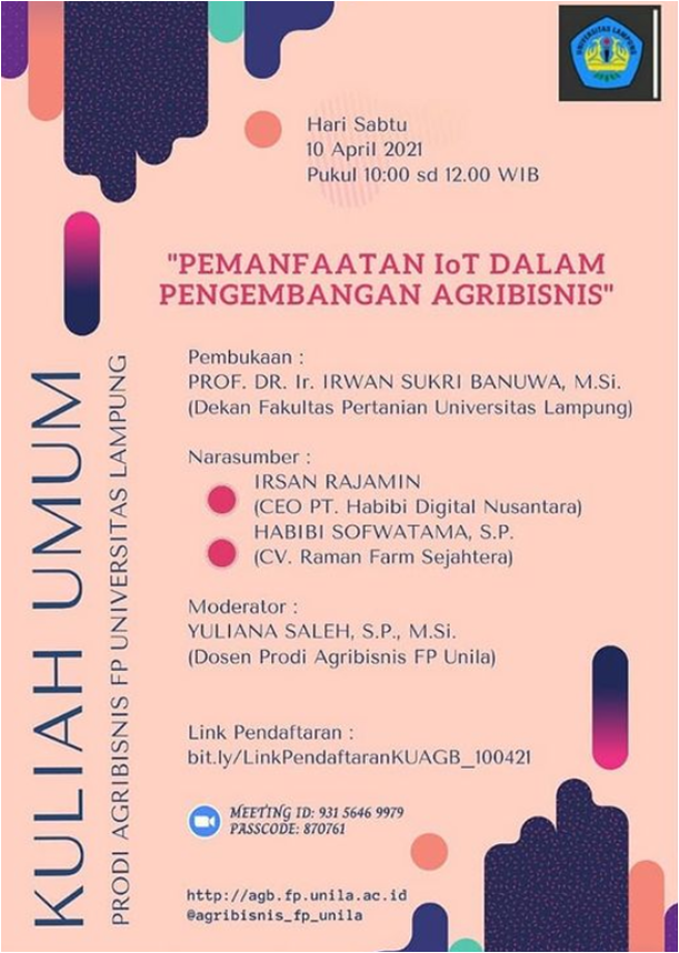 Program Studi Agribisnis Jurusan Agribisnis Fakultas Pertanian Universitas Lampung mengundang Bapak/Ibu/Mahasiswa untuk mengikuti acara: