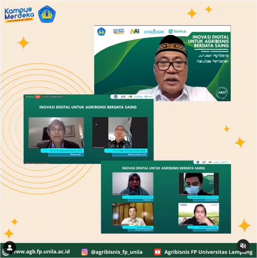 Program Studi Agribisnis Jurusan Agribisnis Fakultas Pertanian Universitas Lampung bekerjasama dengan Asosiasi Agribisnis Indonesia (AAI) telah menyelenggarakan Seminar Nasional “Inovasi Digital untuk Agribisnis Berdaya Saing” pada hari Sabtu tanggal 26 Juni 2021 mulai pukul 09.00 WIB s.d. pukul 12.00 WIB. Seminar Nasional dipandu oleh Dinda Anisa Yuliana (Agribisnis ’18) sebagai MC. Acara pembukaan diawali dengan laporan pelaksanaan kegiatan oleh Bapak Dr. Teguh Endaryanto, SP. MSi. selaku Ketua Jurusan Agribisnis FP Unila dan dibuka secara resmi oleh Bapak Prof. Dr. Ir. Irwan Sukri Banuwa, MSi. selaku Dekan Fakultas Pertanian Universitas Lampung yang kemudian diakhiri dengan do’a yang dipimpin oleh Rofi AL Akbar (Agribisnis ’18).