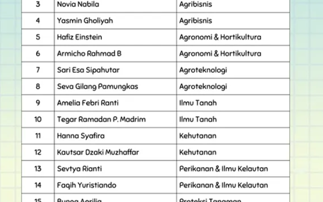 Empat mahasiswa Jurusan Agribisnis Fakultas Pertanian Universitas Lampung (FP Unila) berhasil terpilih sebagai Duta Fakultas Pertanian 2025 adalah Carlos Roberto, Dian Sasi Kusuma, Novia