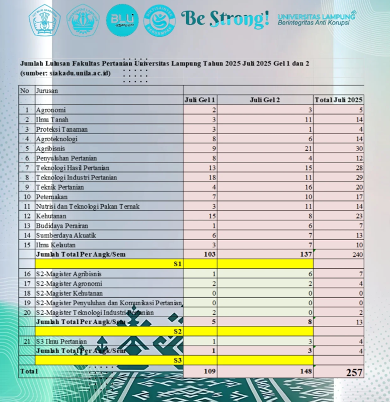 Sebanyak 49 mahasiswa Jurusan Agribisnis Fakultas Pertanian Universitas Lampung (FP Unila) resmi mengikuti prosesi Yudisium Periode Juli 2025. Kegiatan ini menjadi momen penting bagi para calon wisudawan sebelum melangkah ke jenjang berikutnya dalam karier akademik maupun profesional.