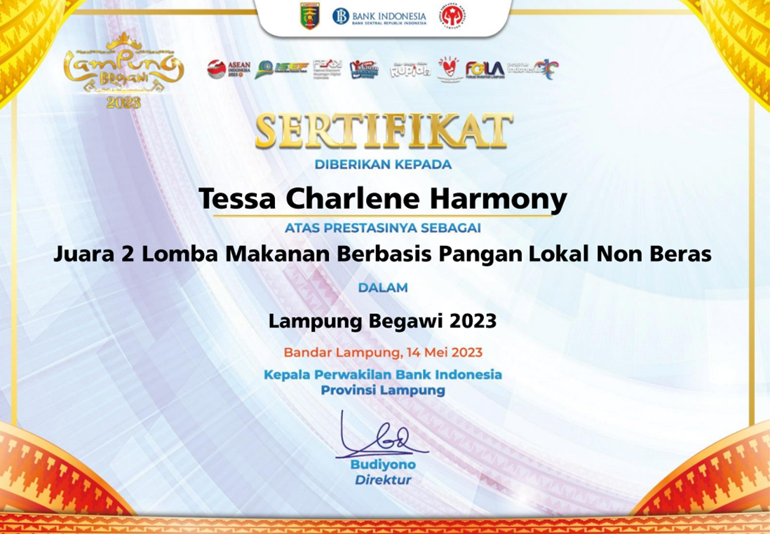 Selamat dan sukses untuk Tessa Chalene Harmony Mahasiswa Jurusan Agribisnis Fakultas Pertanian Universitas Lampung atas capaian prestasinya meraih Juara 2 Lomba Makanan Berbasis Pangan Lokal Non Beras pada 14 Mei 2023 dalam acara Lampung Begawi 2023) yang diselenggarakan oleh Kantor Perwakilan Bank Indonesia Provinsi Lampung. Semoga terus berprestasi dan menginspirasi kita semua.