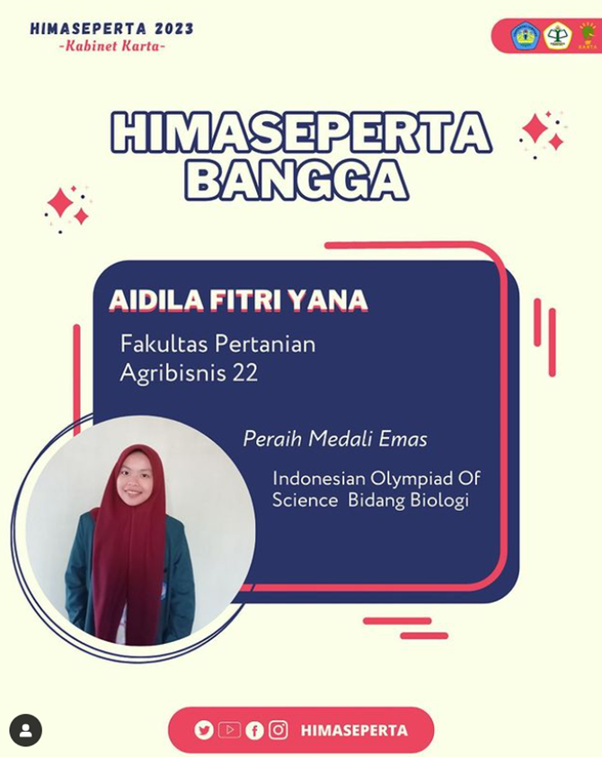 Selamat dan sukses untuk Aidila Fitri Yana, mahasiswa Jurusan Agribisnis Fakultas Pertanian Universitas Lampung atas capaiannya menjadi Peraih Medali Emas dalam Indonesian Olympiad of Science Bidang Biologi. Indonesian Olympiad of Science adalah sebuah event kompetisi sains tingkat nasional yang diadakan untuk menjadi ajang berkompetisi dalam bidang sains secara nasional. Semoga terus menginspirasi untuk prestasi berikutnya.
