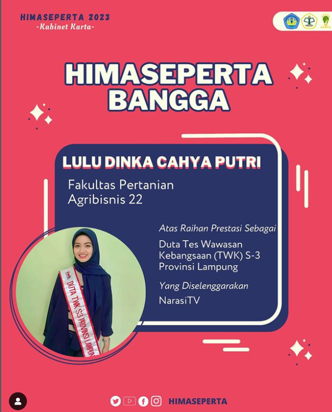 Selamat dan sukses untuk Lulu Dinka Cahya Putri atas capaiannya sebagai Duta Wawasan Kebangsaan (TWK) Season 3 Provinsi Lampung yang diselenggarakan NarasiTV. TWK merupakan program NarasiTV yang bertujuan untuk meningkatkan pengetahuan generasi muda tentang wawasan kebangsaan, ketertarikan terhadap keunikan setiap provinsi di Indonesia, dan menghapus stigma negatif yang melekat di Indonesia dengan cara mengungkap kekayaan setiap […]