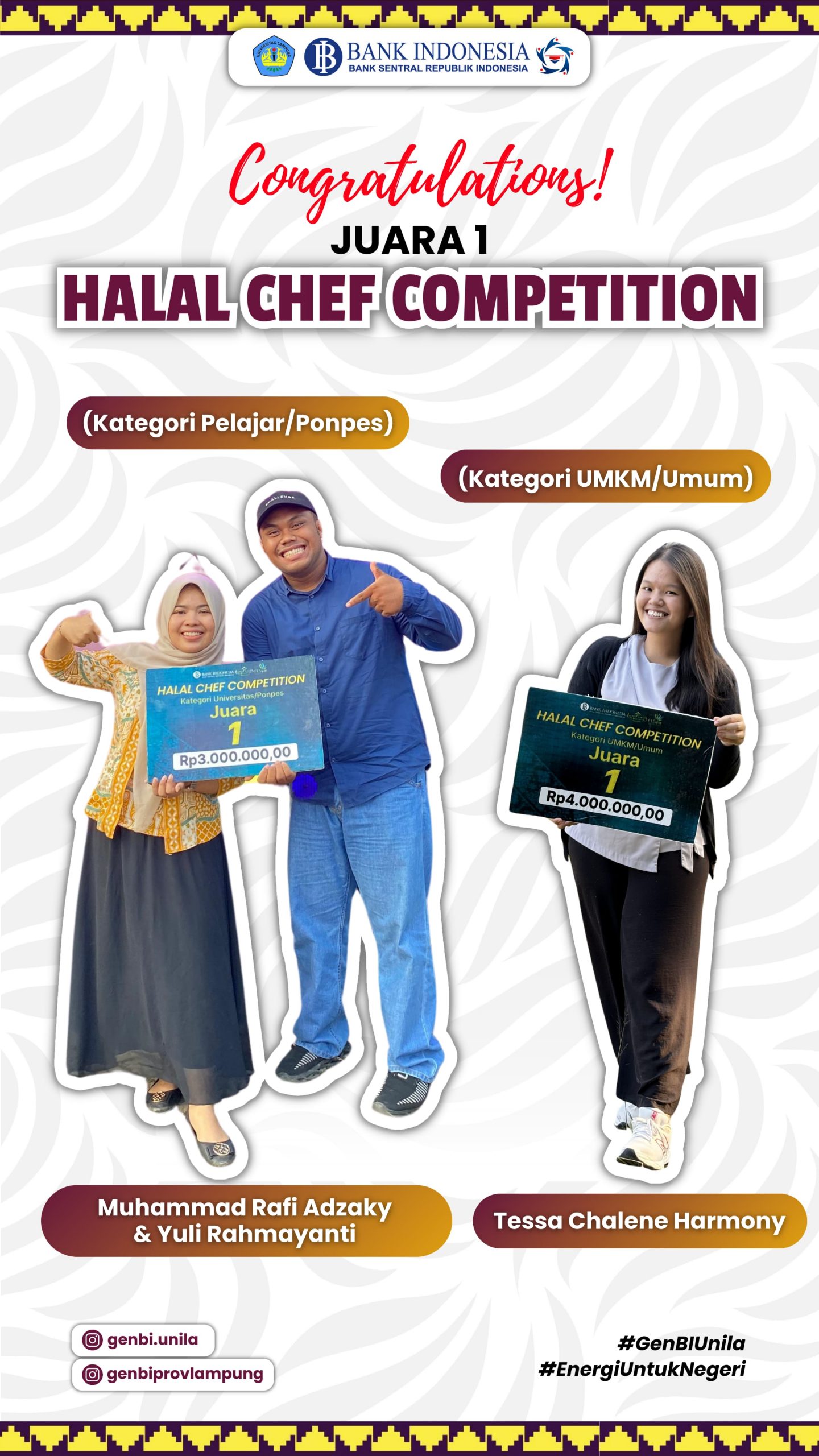 Selamat dan sukses untuk Tessa Chalene Harmony Mahasiswa Jurusan Agribisnis Fakultas Pertanian Universitas Lampung atas capaian prestasinya meraih Juara 1 Halal Chef Competition pada 2 April 2024 (Kategori UMKM/Umum). Semoga terus berprestasi dan menginspirasi kita semua.